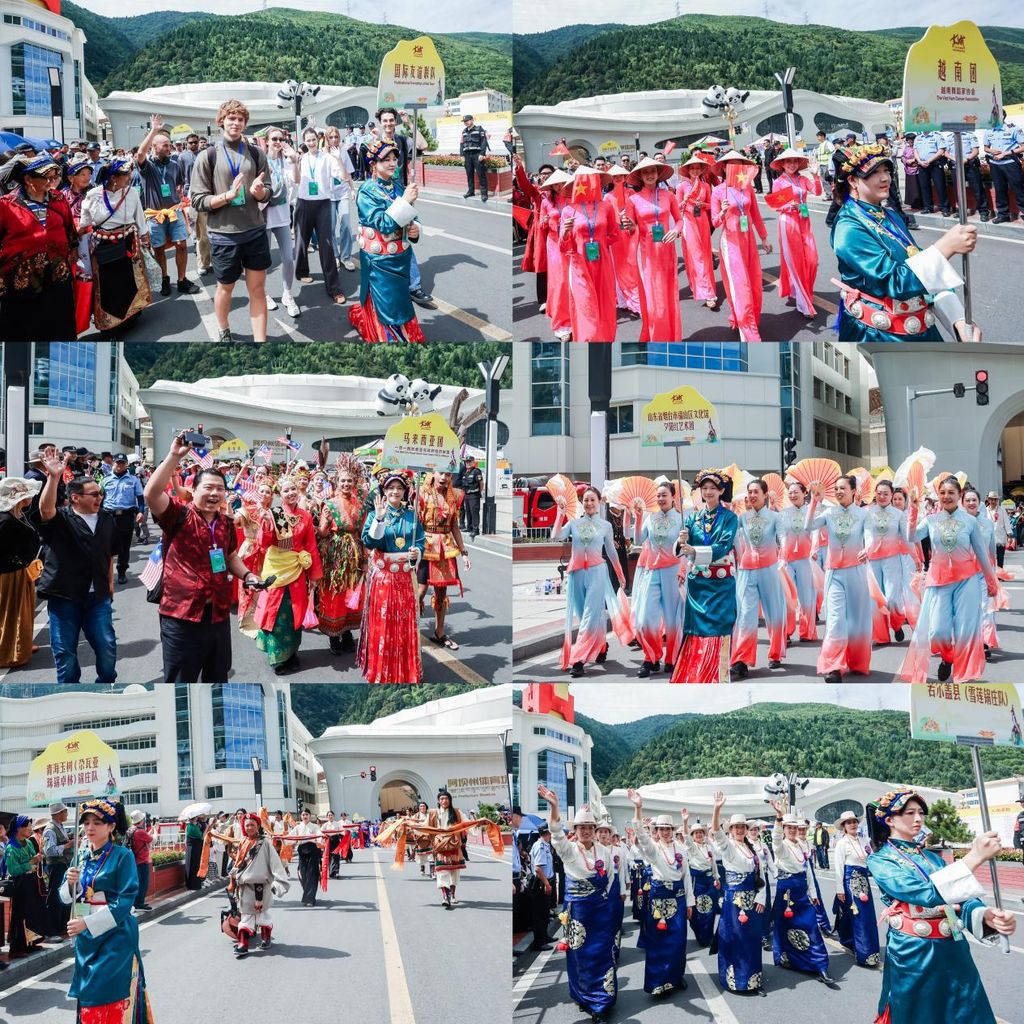 作为本届活动的一大亮点,“锅庄巡游”于开幕式后正式启程。巡游队伍由来自国内外的30余支锅庄团队和现场游客组成,从阿坝州体育场出发,沿九州广场至团结广场行进约1.5公里。各队身着民族盛装,在城市街头共跳锅庄、载歌载舞,呈现一幅多民族共庆、全民共舞的和谐画卷。